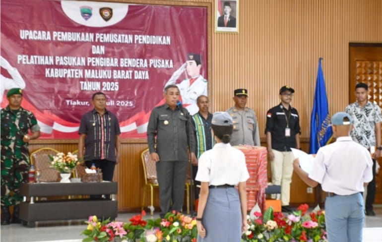 Tiakur, investigasibhayangkaraindonesia- Bupati Maluku Barat Daya (MBD), Benyamin Th. Noach bersama Wakil Bupati MBD, Agustinus L. Kilikily dan Forkopimda MBD menghadiri Upacara Pembukaan Pemusatan Pendidikan dan Pelatihan (Diklat) Pasukan Pengibar Bendera Pusaka (Paskibraka) Kabupaten MBD, bertempat di Aula Penginapan Tiakur Beach, Kamis (31/07/2025).