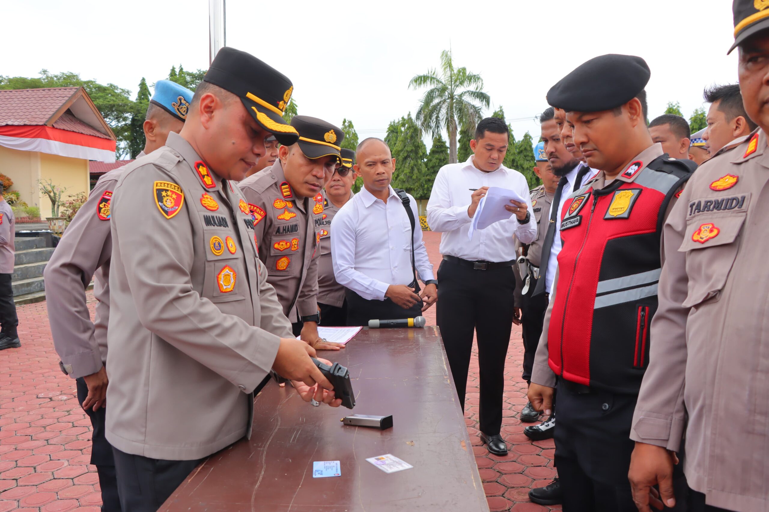 Aceh Tamiang – Polda Aceh, Kapolres Aceh Tamiang AKBP Muliadi, S.H, M.H didampingi Wakapolres beserta PJU melakukan pengecekan Senjata Api Personilnya seusai pelaksanaan apel Pagi dilapangan Parama Satwika Mapolres Aceh Tamiang, Senin (12/8/2024).