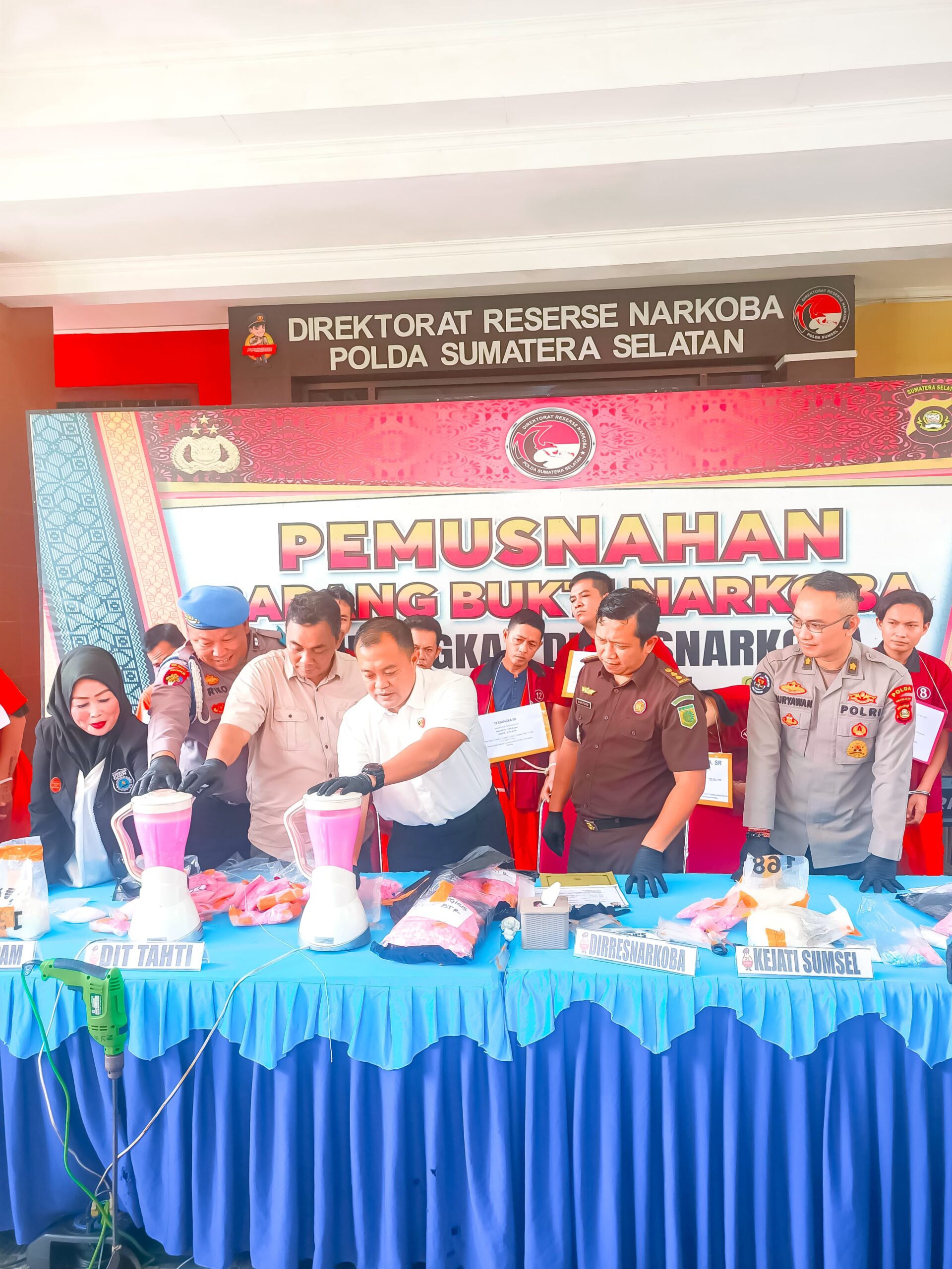 Salah satunya dengan memusnahkan barang bukti sabu 4,55 kilogram dan 23.573 butir pil ekstasi di halaman Ditresnarkoba Polda Sumsel Selasa (15/7/2025).