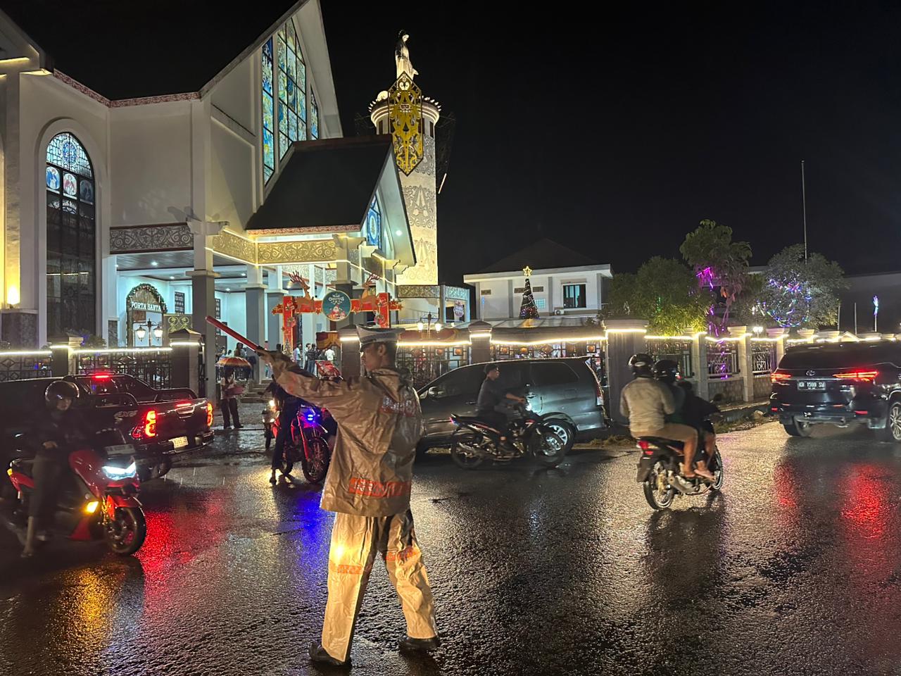 Dengan mengenakan mantel hujan, para petugas tidak beranjak dari posisinya demi memastikan kelancaran arus lalu lintas serta keselamatan jemaat yang sedang melaksanakan ibadah. Pengaturan dilakukan agar kendaraan dapat melintas dengan tertib dan jemaat dapat keluar-masuk area gereja dengan aman dan nyaman.