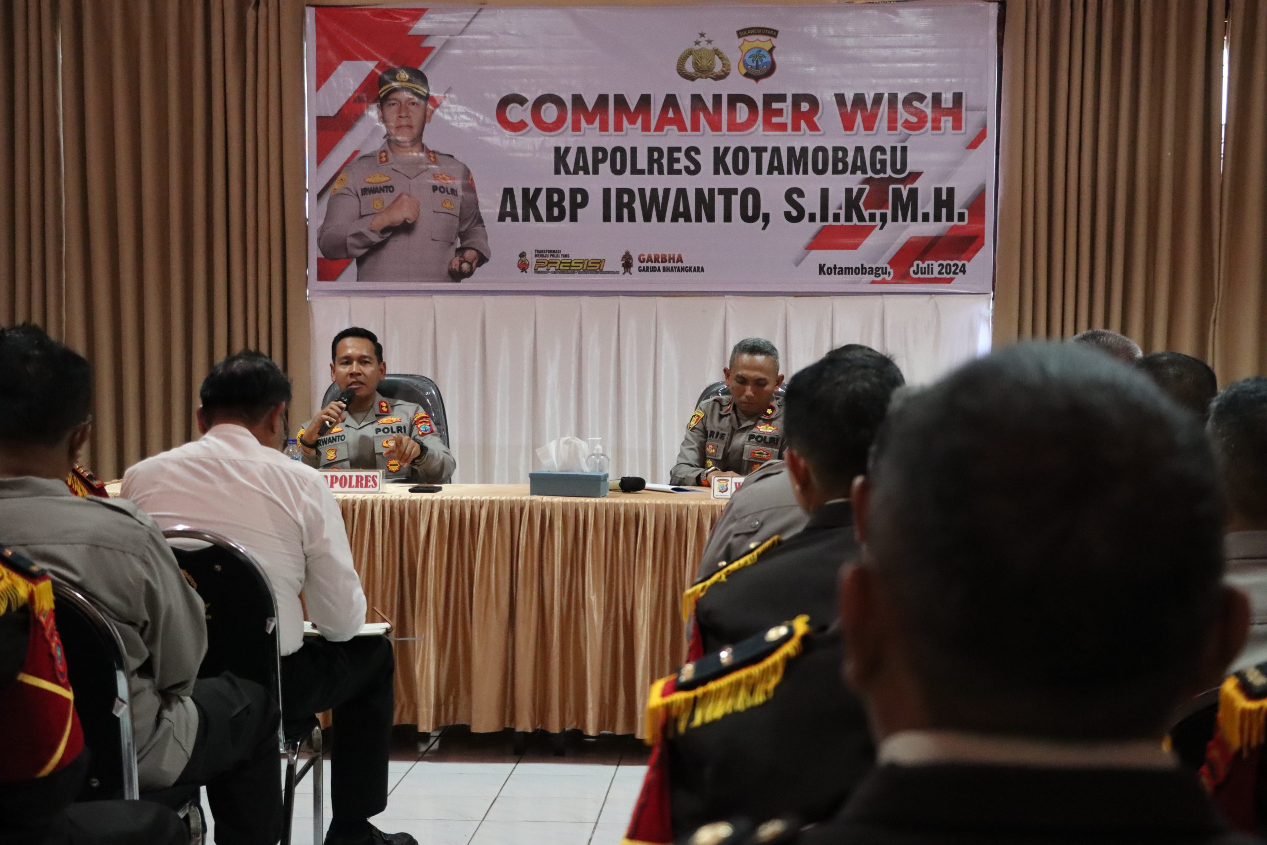Commander Wish ini dilaksanakan di Aula Mapolres Kotamobagu dan dihadiri oleh Wakapolres Kotamobagu Kompol Arie Prakoso SIK MH, bersama jajaran Pejabat Utama Polres Kotamobagu, Para Kapolsek Jajaran, Perwira serta Para Bintara Pemegang Jabatan.