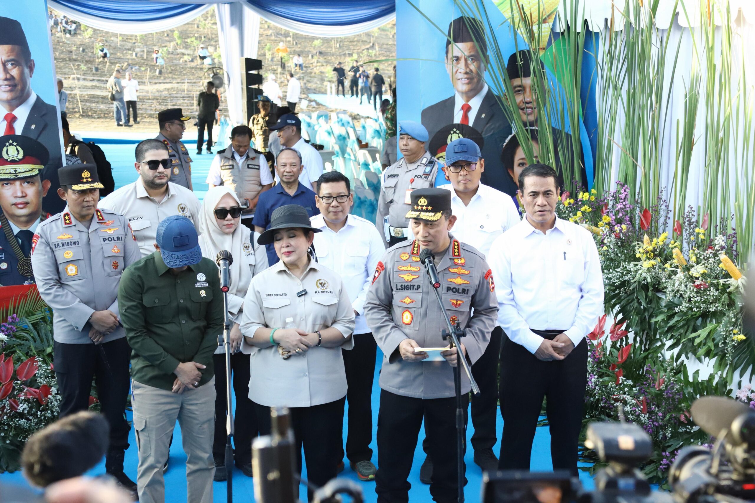 Turut hadir dalam kegiatan ini Ketua Komisi IV DPR RI Ibu Titik Soeharto, Menteri Pertanian Andi Amran Sulaiman, Menteri Kehutanan Raja Juli Antoni, Pejabat Utama Mabes Polri, serta sejumlah tamu undangan dari lintas instansi terkait. Kegiatan ini merupakan bagian dari penanaman serentak kuartal ketiga tahun 2025, yang menandai langkah besar Polri dalam mendukung program pemerintah serta mewujudkan ketahanan pangan nasional melalui optimalisasi lahan perhutanan sosial.