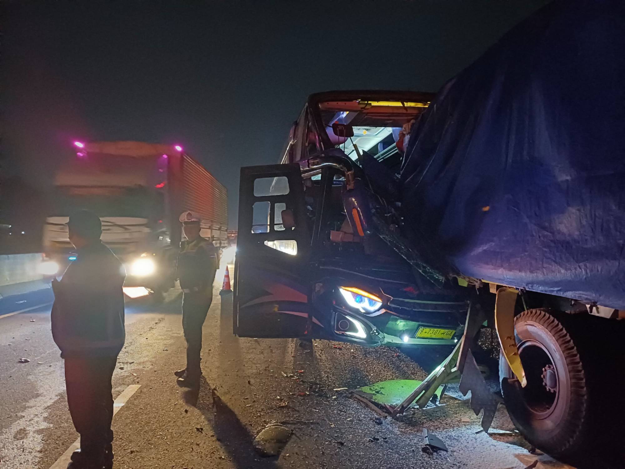 “Jadi dari olah TKP sementara dilapangan, kejadian berawal saat kendaraan bis yang berjalan dari arah Solo ke Jakarta berjalan di lajur cepat. Namun saat di lokasi kejadian muncul Kendaraan truk bermuatan beras dari Sragen menuju ke Jakarta, yang hendak menyalip kendaraan didepannya. Karena jarak yang sudah dekat, bis menghantam bagian belakang truk tersebut.” Jelasnya.