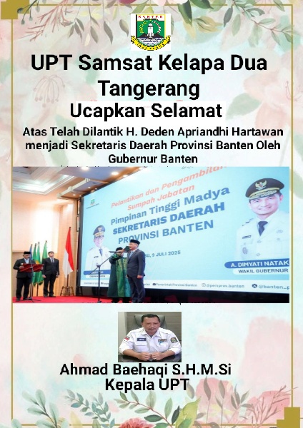 Kepala UPT Samsat Kelapa Dua Tangerang, Ahmad Baehaqi Mengucapakan Selamat Kepada H. Deden Apriandhi Hartawan Yang Telah Dilantik Menjadi Sekretaris Daerah Provinsi Banten oleh Andra Soni Gubernur Banten