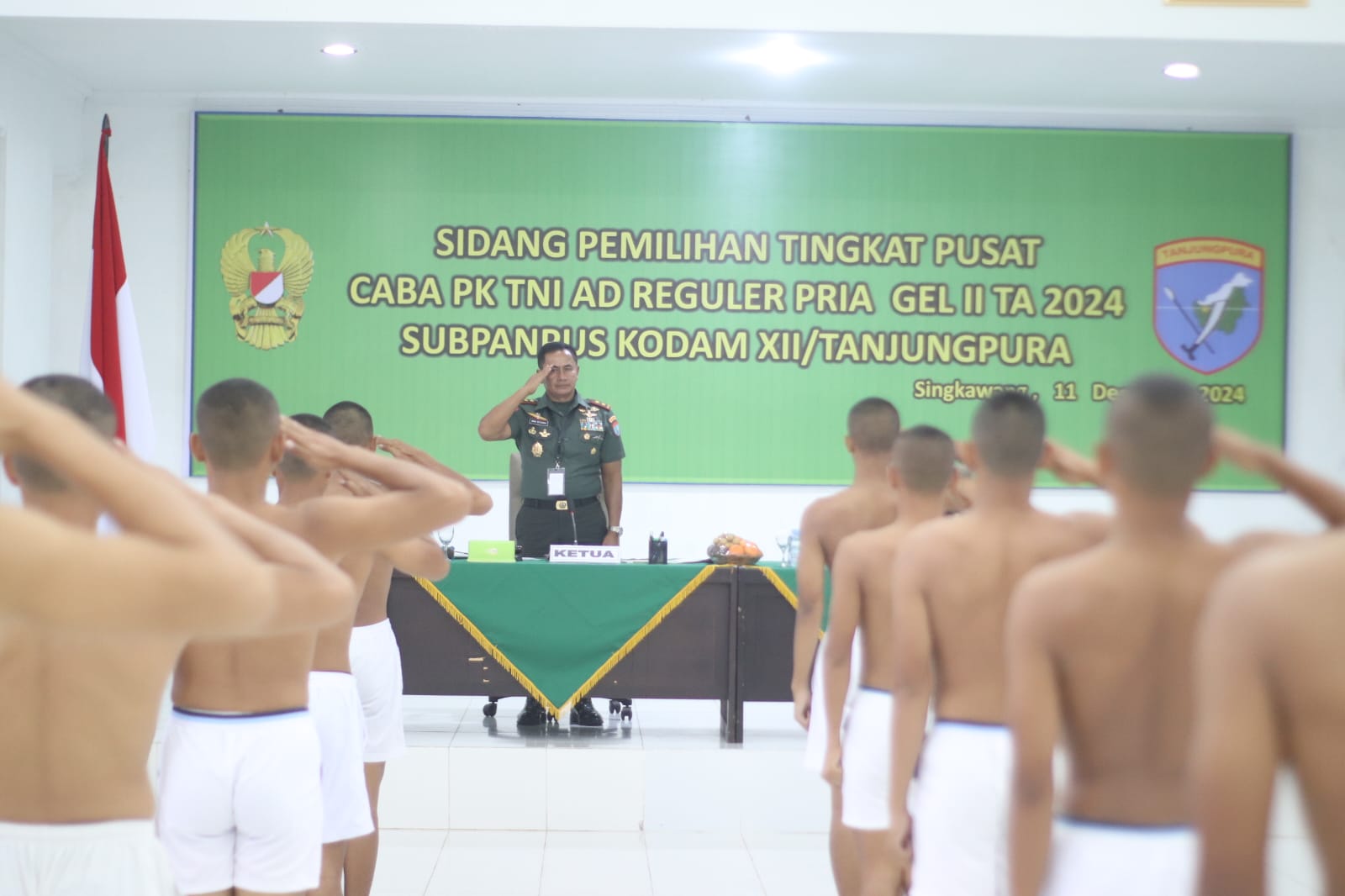 Singkawang – Pangdam XII/Tanjungpura, Mayor Jenderal TNI Iwan Setiawan, S.E, M.M., memimpin langsung Sidang Pemilihan Tingkat Pusat Penerimaan Calon Bintara Prajurit Karier (PK) TNI Angkatan Darat Gelombang II TA 2024 di Rindam XII/Tpr, Kota Singkawang, Rabu (11/12/2024).