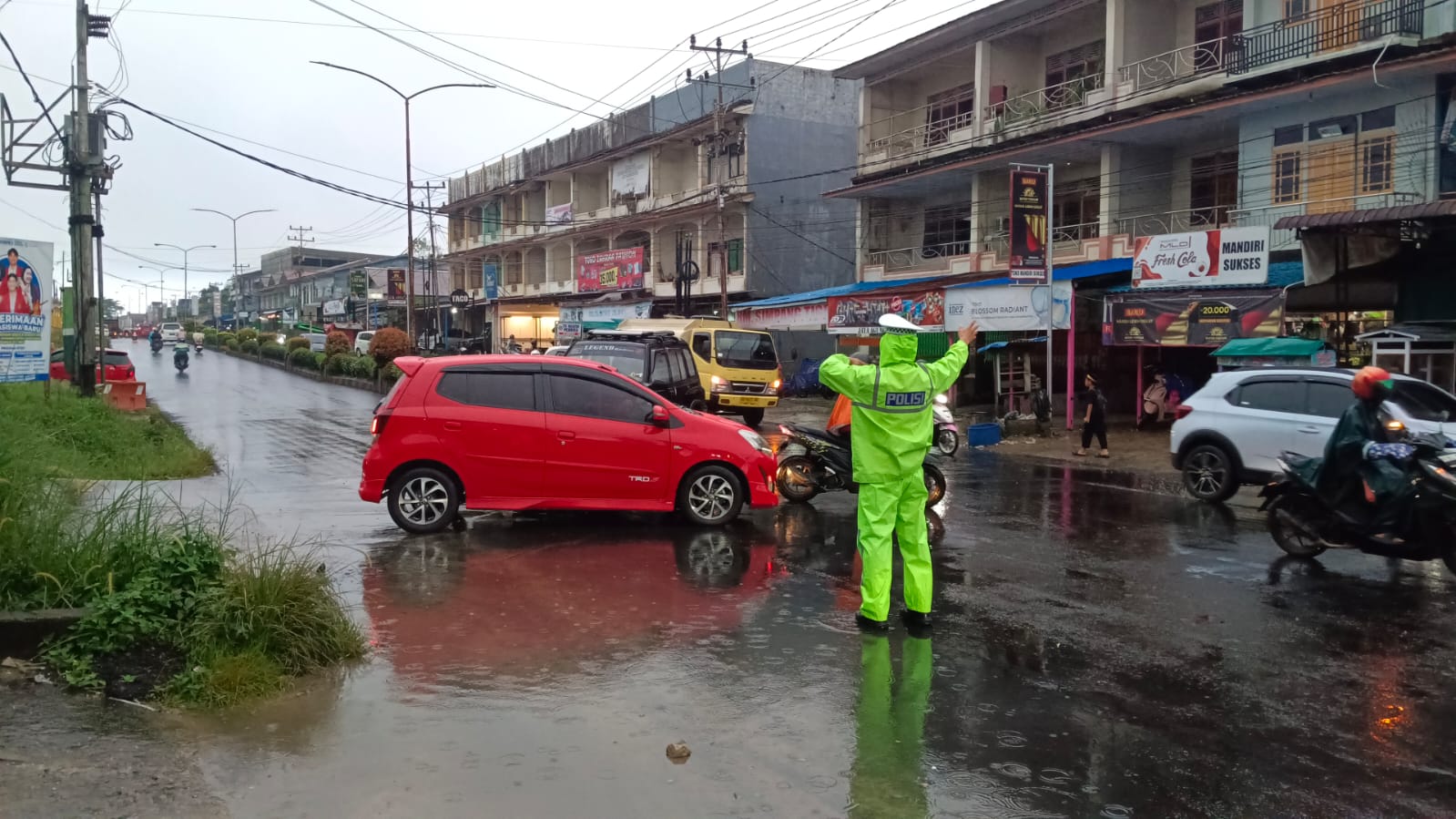 Dengan mengenakan jas hujan dan perlengkapan dinas, para Polantas tetap sigap mengarahkan kendaraan yang melintas. Kondisi cuaca yang basah dan jalanan licin berpotensi menimbulkan kemacetan maupun kecelakaan. Namun, kehadiran para petugas di lapangan menjadi bentuk nyata upaya pencegahan agar aktivitas masyarakat tetap berjalan dengan aman dan lancar.