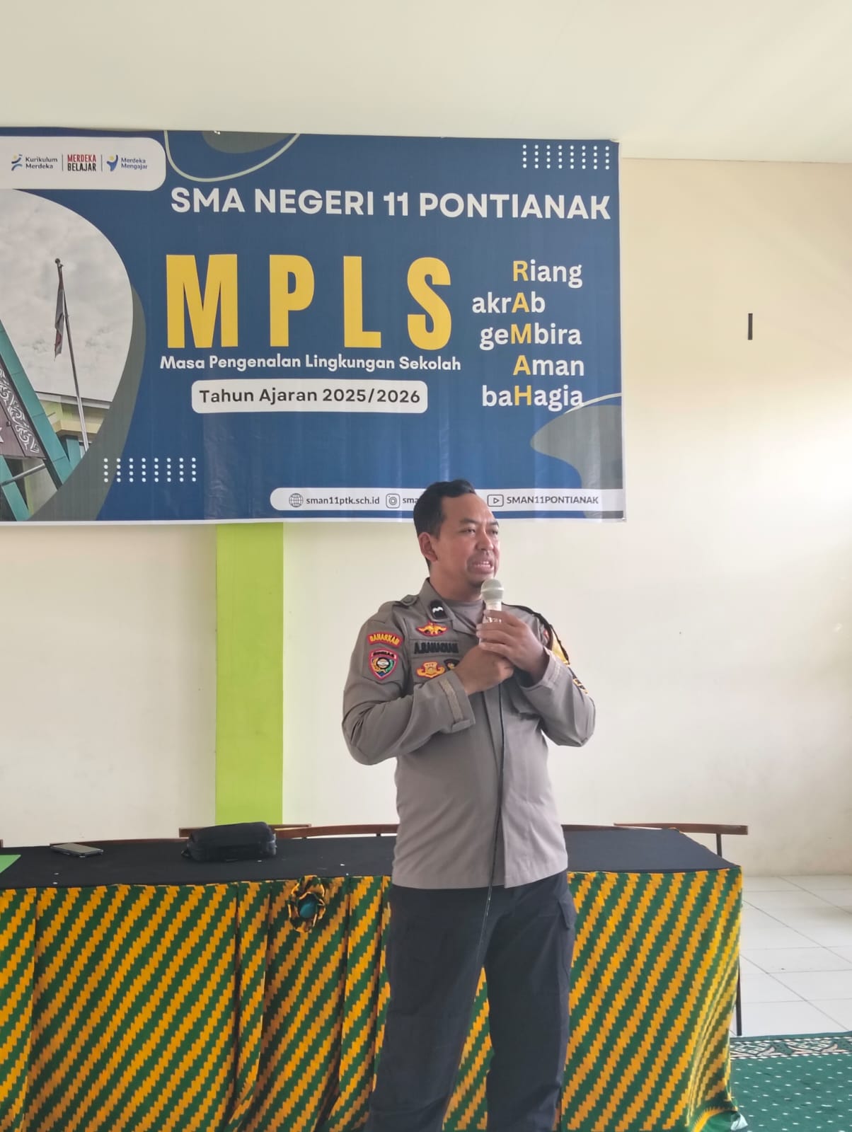 Pontianak, Kalbar – Dalam rangka menciptakan generasi muda yang tangguh, cerdas, dan berkarakter, Kanit Binmas Polsek Pontianak Barat Iptu Sugiyanto bersama Bhabinkamtibmas Kelurahan Sei Beliung Aipda Andi Rahadian S.E. melaksanakan kegiatan sosialisasi kepada para siswa-siswi baru SMA Negeri 11 Pontianak, Jalan Nipah Kuning Dalam, Kelurahan Sei Beliung, Kecamatan Pontianak Barat, pada kegiatan Masa Pengenalan Lingkungan Sekolah (MPLS) Tahun Ajaran 2025/2026. Kamis (17/7).