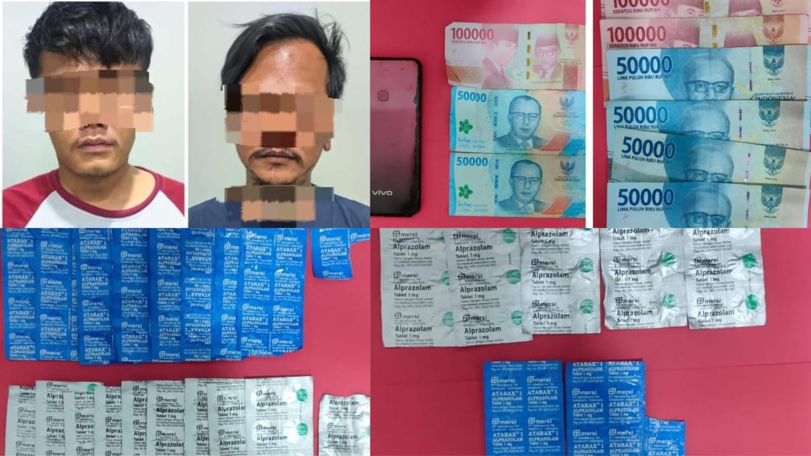 Sementara dari tersangka STP diamankan barang bukti berupa 1 (satu) buah tas pinggang warna hitam berisi 51 (lima puluh satu) butir obat kemasan warna silver bertuliskan mersi Alprazolam tablet 1 mg, 22 (dua puluh dua) butir obat kemasan warna biru bertuliskan Atarax®1 Alprazolam, uang tunai sebesar Rp. 500.000,- (lima ratus ribu rupiah) dan 1 (satu) buah handphone Redmi 12C warna hitam.